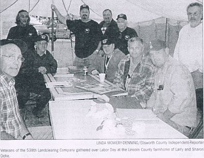 ~~~~~~~~~~~~~~~~~~~~~~~~~~~~~~~~ REUNION AT LINCOLN FARM REUNITES VIETNAM VETS Ellsworth County/Independent Reporter Published: September 11, 2003 by: Linda Mowery-Denning Editors note-Sharon and Larry Dohe are the parents of Ellsworth city Treasurer Angela Mueller. They live 9 miles north of the Interstate 70 Vesper exit. For more than 30 years, the men of the 538th Landclearing Comapny kept the silence - many of them never letting on how a year or more spent in the thickest jungles of Vietnam changed their lives. Years ago, when Larry Dohe's daughter, Angela, wanted to write a school paper about her father's experiences, he refused. The memories were too fresh. It wasn't until three years ago, after company veteran Roger Briggs of Kentucky brought them all together for their first reunion since the war, that the stories of the 538th poured out, bringing a sense of closure to those who told them. Another reunion followed a year later in Peoria, Ill., and this past Labor Day weekend, 19 company veterans navigated the muddy rural roads of Lincoln County for a third meeting at the farmhome of Larry and Sharon Dohe. Parked near the house were cars from Maryland, Kentucky, Indiana and almost a dozen other states. "We've never laughed so much and cried so much." Sharon Dohe said *** The mission of the landclearing company was to clear the jungles of South Vietnam so the enemy wouldn't have a place to hide and ambush U.S. troops as they moved along highways. Dan Bishop, who served during the summer of 1970, said the drivers and their support crews were up before sunrise six days a week, inspecting their machines and preparing for 12-hour days. The plows were lined up single file to head for 'the cut', the area that needed to be cleared. This often was done with the help of a helicopter overhead because the jungle was too thick for the plow driver to see ahead. At the site, drivers cut a 'trace' to mark the boundaries of the cut. As the designated area was cleared, the plows moved farther into the jungle. The company was highly mobile, moving its fire base or headquarters camp an average of every 10 days. "You just cleared and kept clearing," Larry Dohe said. Typically, the crews cleared 150 meters - or more than the length of a football field - on both sides of a highway. Ken Read of Fort Worth, Texas said drivers could clear a square mile each day, - if all the bulldozers were operational, which wasn't always the case. Two kinds of plows were used by the company. The Rome Plow was equipped with a stinger blade to split trees, thus weakening them enough to push over. The other plow featured a Bull Blade to cut a trench along the side of the tree, weakening its root base. After they fell, the trees were pushed into a burn pile. It's almost impossible to imagine the dangers that threatened the company as it plowed through the jungle. There was the constant fear of landmines or boobytraps. Drivers were protected on front and beneath by thick metal. Yet there was no protection against flying shrapnel from a well-placed mine. And later the Viet Cong became smarter - placing the traps in the trees above the plows, hoping for more damage. "Every day, you didn't know whether you were going to make it or not. That's war, I guess," Dohe said. Beyond the enemy was the jungle itself. There were three levels of growth, each harboring critters that could bring almost instant death. Bishop said snakes up to 25 feet in length would fall from the trees, hitting the hot hood of the plow. The only place for them to go was inside the cab. "There were 100 varieties of snakes in Vietnam. Ninety-nine of them were deadly poisonous and the 100th would squeeze you and eat you whole. You'd see a snake coming over the top of the blade and you'd put it in reverse and pray you'd get out of there in time." The terrain was another challenge for the dozers. Some of the slopes were so steep, a driver was forced to ride with his feet braced up against the instrument panel to keep from falling out of the cab. In places, the jungles was so dense that only black puffs of diesel smoke were visible as a plow inched through the growth. Larry Dohe said the noise from the 30 bulldozers in the cut was deafening. Several of the veterans attribute their hearing loss to their time with the 538th. And in the soil was toxic residue from Agent Orange, a chemical defoliant used by the United States during the war. At night, the men returned to their fire base, which contained maintenance and mess facilities and other so-called conveniences. An old tanker trailer with spigots coming out the bottom doubled as a shower. Of course, the water was sandy, but it removed the dirt and grime of a long hard day. Protection came from a berm around the camp. Bishop said company engineers worked during the day and the infantry pulled security duty at night. Enemy rockets and an occasional mortar were part of camp life. *** It's hard to forget. "I had a friend from Independence, Kan., who was spit on when he came home. He's never forgotten it," Larry Dohe said. Larry McCain from Kentucky nodded his head in agreement. The same thing happened to him. "We crawled back into society after the Vietnam War," Dan Bishop said. It's Sunday night and the veterans are gathered in a tent at the Dohe farm, not unlike the ones they shared in Vietnam. For some, this is the first gathering they've attended. Bishop and Dohe, for instance, saw each other for the first time in 33 years. Most of them were 19 - and 20 - year-olds when the served in Vietnam. They returned home much older in spirit to work as truck drivers, electricians, farmers and postal employees. Some extended their time in Vietnam by a few months so they wouldn't have to spend the final weeks of their active duty stateside. After Vietnam, the last thing they wanted was the 'spit and shine' of the domestic military. Dan Bishop remembers watching the fall of Saigon, seeing the American flag come down from the em